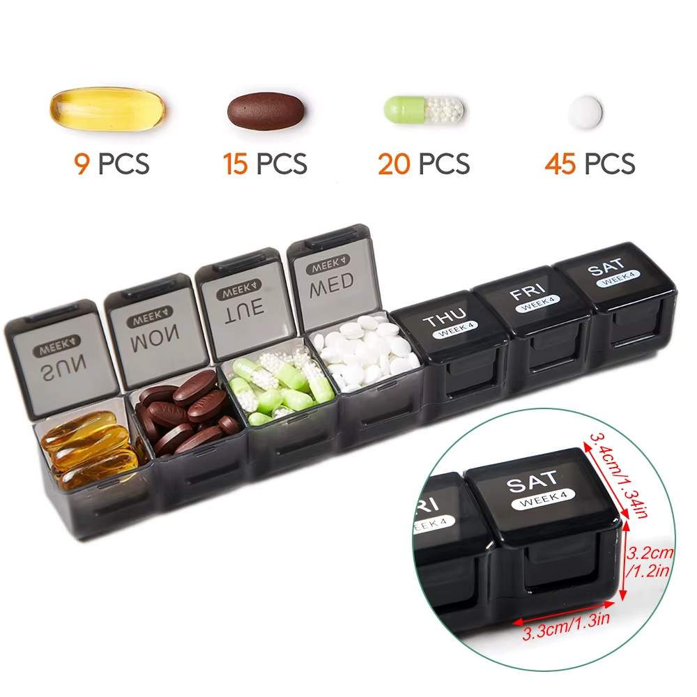 Med et design som inkluderer 28 rom, kan du enkelt organisere medisinene dine for opptil fire uker. Den fargekodede strukturen og de tydelige ukedagene gjør det enkelt å følge med, og du slipper å bekymre deg for å glemme en dose.