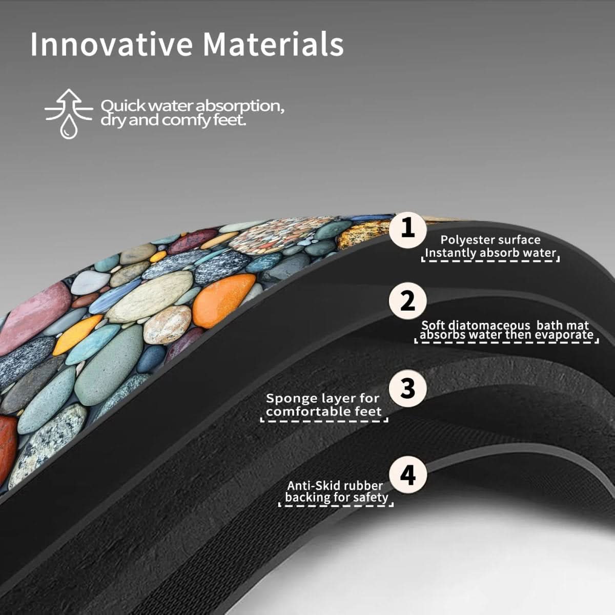 Med sin evne til å absorbere vann umiddelbart og la det fordampe raskt, holder den gulvene rene og tørre. Den sklisikre baksiden gir stabilitet på glatte overflater, og den holdbare blandingen av diatoméjord, regenerert svamp og naturgummi sikrer langvarig bruk.
